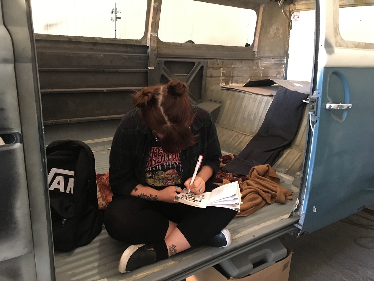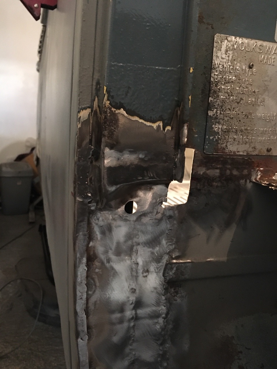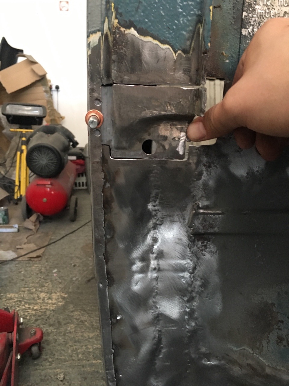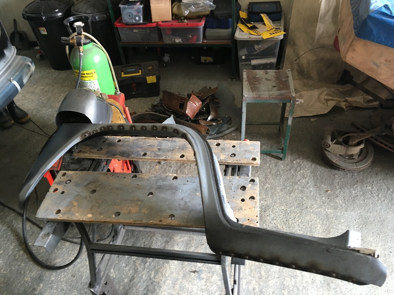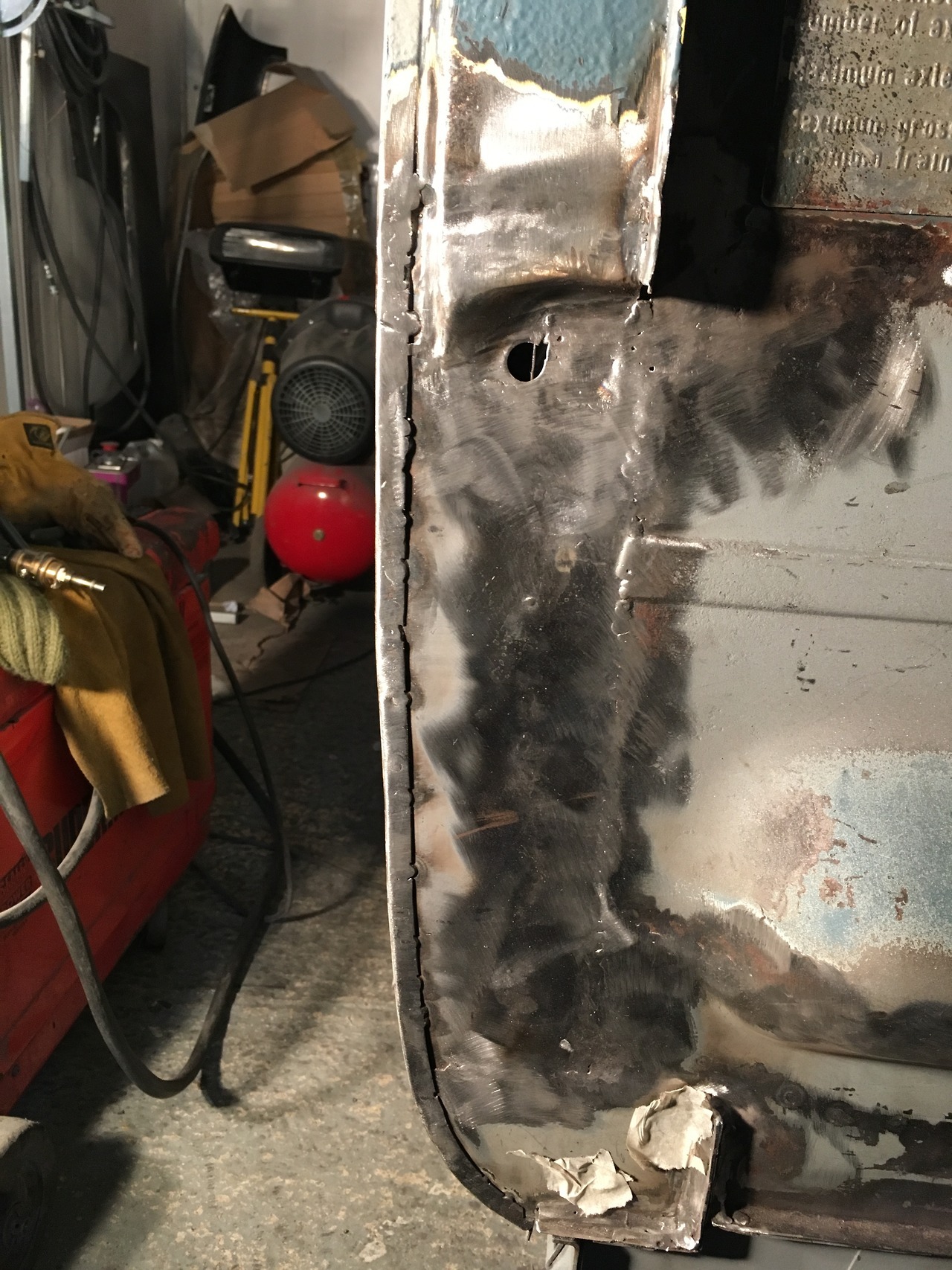 Got the inner and outer driver’s wheel arch welded together today. Max came down to do the all important workshop crossword!