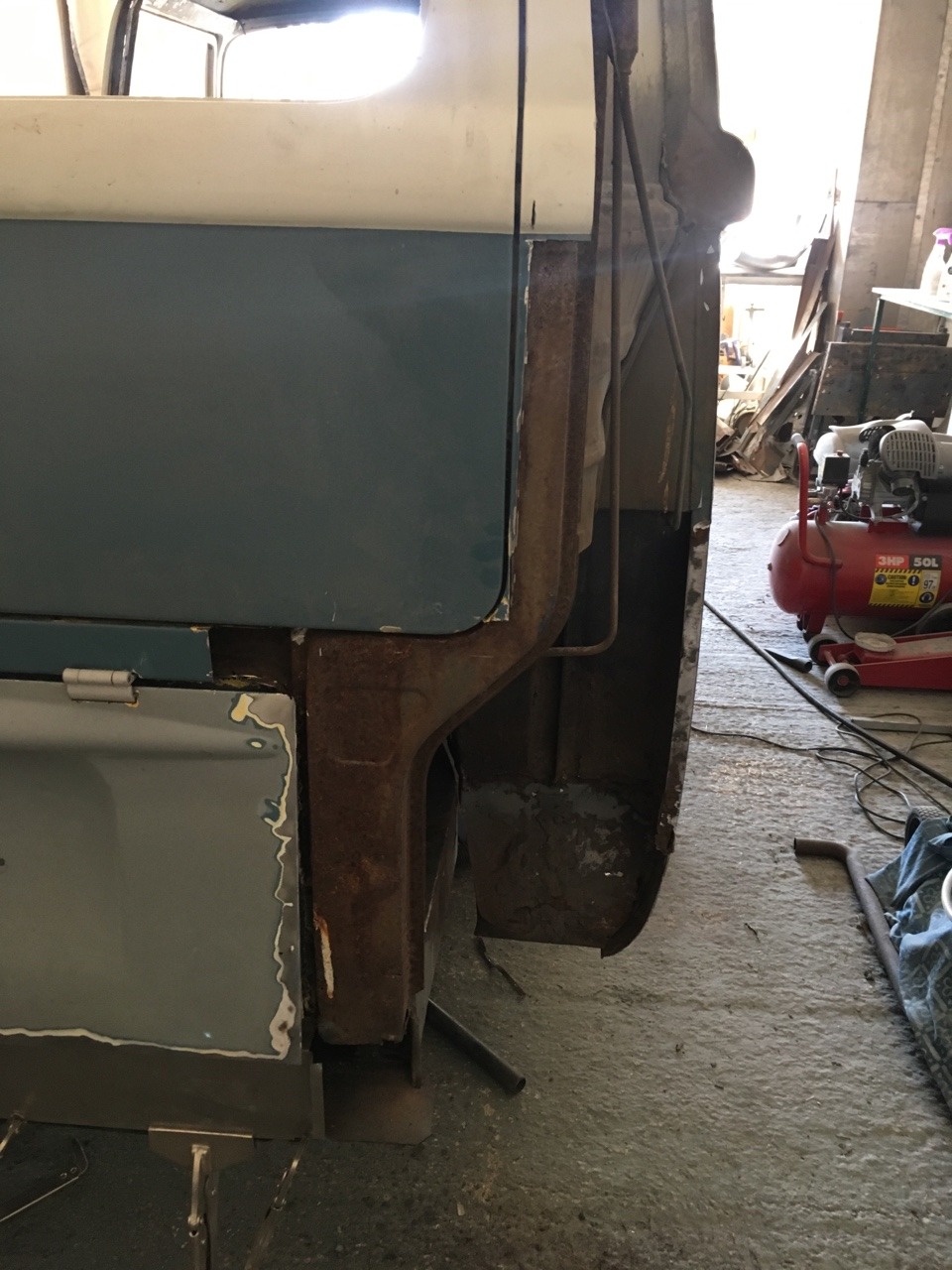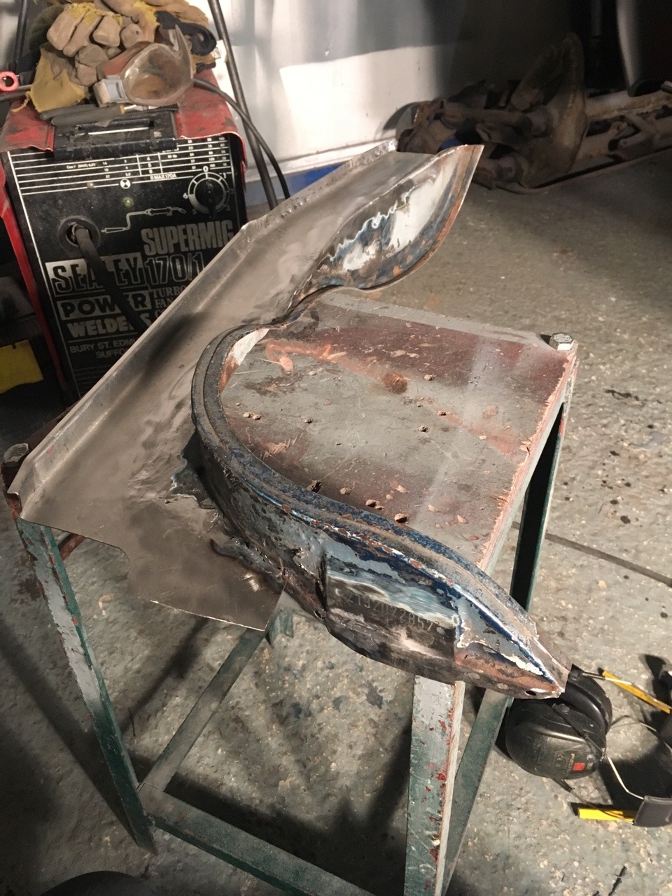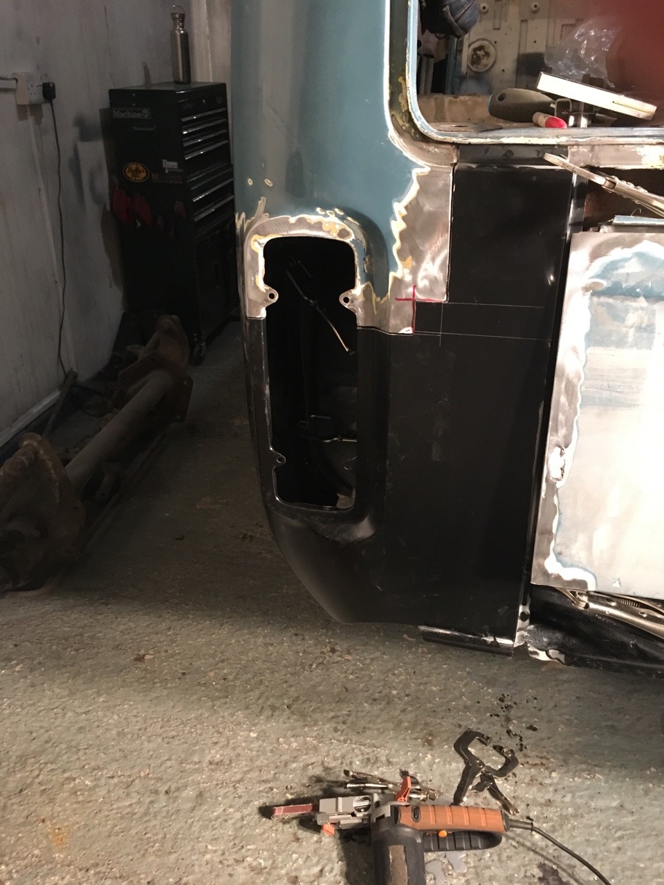Cut out the previous repair to the rear of the inner arch, which consisted of the original rusty piece sandwiched between two sheets of tacked on metal. I should get this repair welded in tomorrow and make a start on repairing the D pillars.