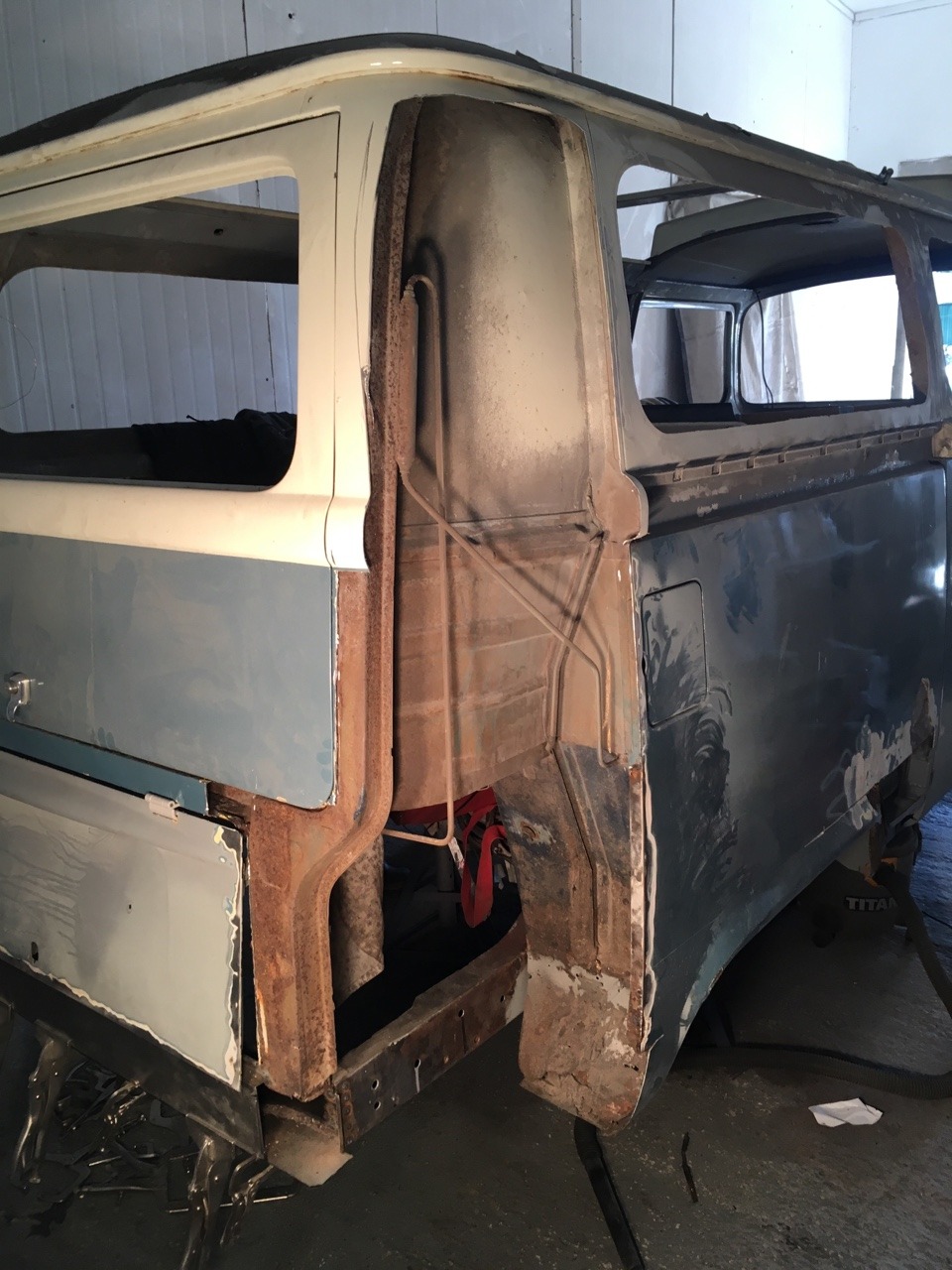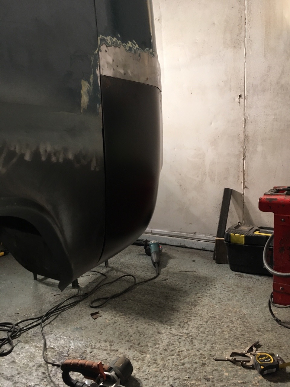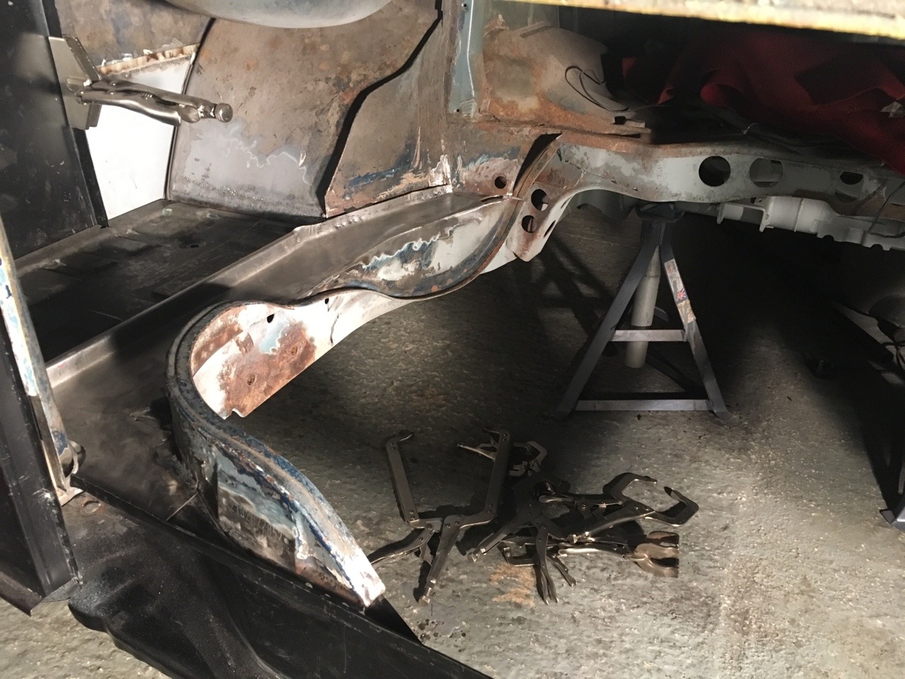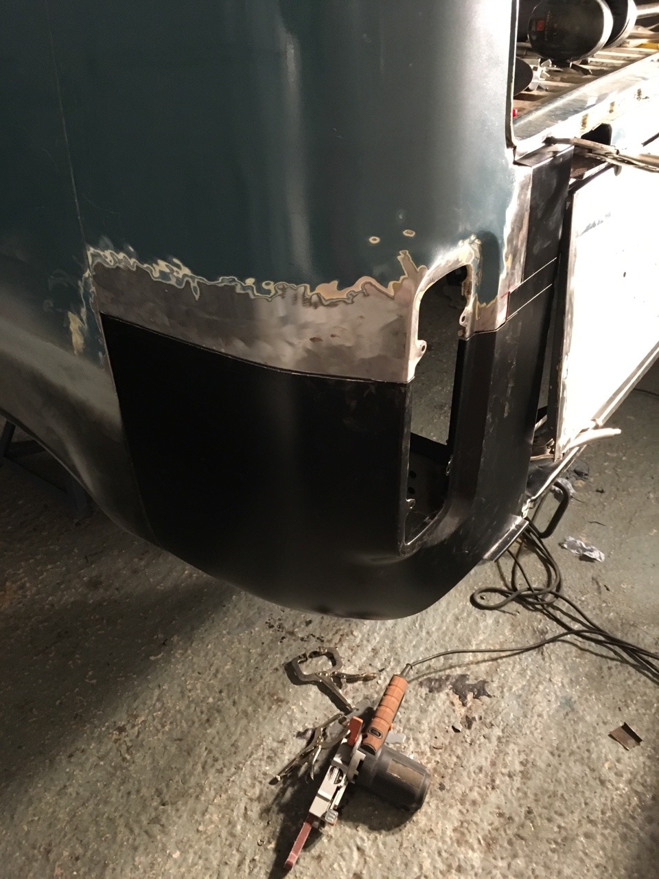 Cut out the previous repair to the rear of the inner arch, which consisted of the original rusty piece sandwiched between two sheets of tacked on metal. I should get this repair welded in tomorrow and make a start on repairing the D pillars.